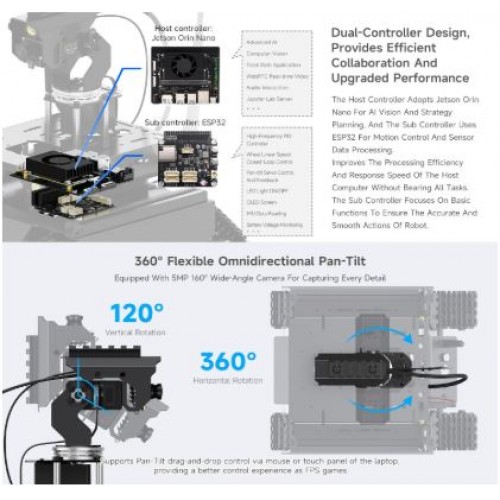 - Equipped with the high-performance Jetson Orin series computer to meet the challenges of complex strategies and functions, and inspire your creativity. Adopts dual-controller design, combines the high-level AI functions of the host controller with the high-frequency basic operations of the sub controller, making every operation accurate and smooth.