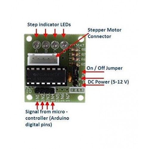 This is ULN2003 Stepper Motor Driver Board, small size and easy to use. It uses the ULN2003 driver chip to amplify the control signal from the Arduino. This Ultra Lightweight and cheap option commonly used to run and control the small applications stepper motors.