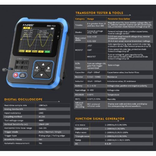 • Transistor tester functions Various types of passive components including NPN and PNP triodes, N- and P-channel metal oxide semiconductor field effect transistors, JFETs, diodes, double diodes, thyristors, as well as resistors, inductors, capacitors, field effect transistors, etc.